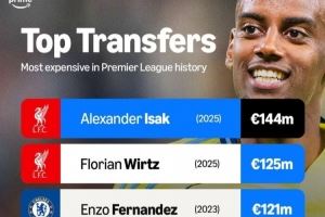 体育资讯9月2日讯 利物浦已经官宣签下伊萨克。数据统计显示,英超历史最贵转会前6名均发生在最近4年,而红军在今夏两次刷新了英超历史标王纪录。