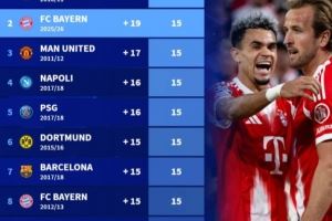 2、拜仁2025/26赛季15分19个净胜球